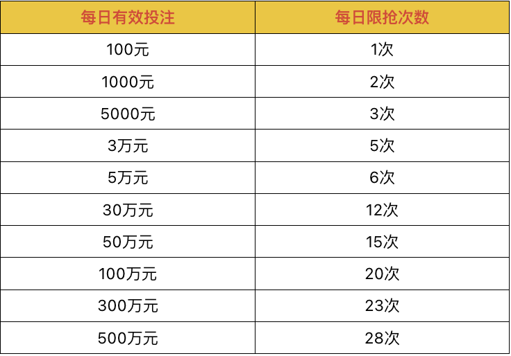 当日存款和打码达到活动要求可额外参与每日最高10次红包抢夺,单个红包最高91388元,心动不如马上行动,快快邀请好友一起加入参与吧~!